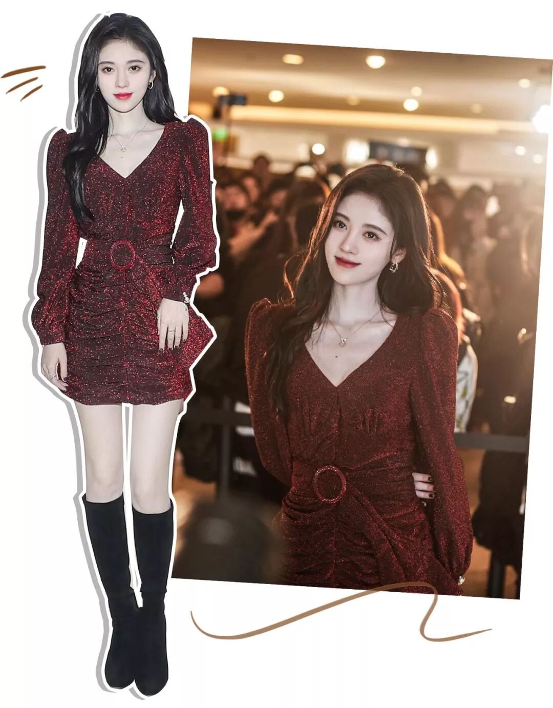 收腰长裙的造型配上黑发大波浪,气场简直slay。