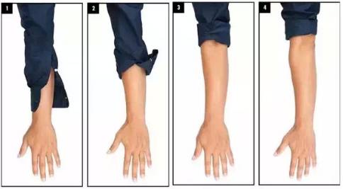 解开衬衫袖口上的扣子,一层一层往上卷,袖边的宽度不要太宽也不要太窄。注意保持卷起的衬衫面料平整。