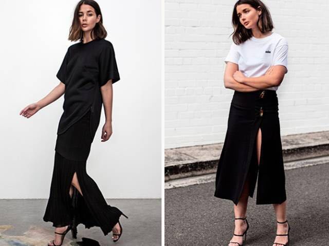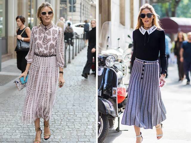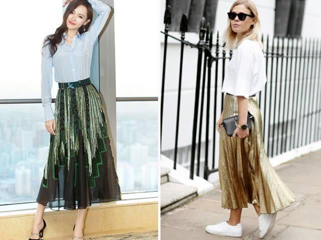 其实她的显瘦秘诀并不在于具体选择了哪种版型的裙子,关键是在于裙子的开衩设计上。给裙子加入一点开衩设计,既不用担心你的粗腿会曝光,相反适度露肤还能在视觉上修饰你的腿部线条——露了肉的同时又巧妙遮住部分腿围,能给人一种变瘦了的错觉。并且开衩设计还能够在视觉上起到拉长腿部线条、让造型变得轻盈的出色作用,可以让你看上去更为高挑,身型拉长了,自然也会显瘦不少。T型身材的女生有着完美的上半身,但臀部却比较扁平缺乏线条感。而想要更好地修饰自己扁平的臀部让其看上去更加饱满,就应选择一些层次感鲜明、带有褶皱设计的裙装,像近两年大热的百褶裙就是非常适合日常穿搭的完美之选。