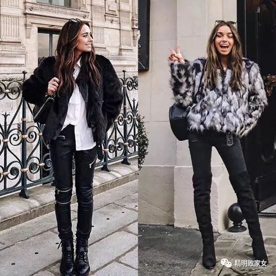 像上图博主这样,上半身穿上宽松的皮草时,下半身搭配一码色的铅笔裤短靴或者干脆穿上过膝长靴都是不错的选择。起码腿还是能显得又细又长,中和了上半身的臃肿感。