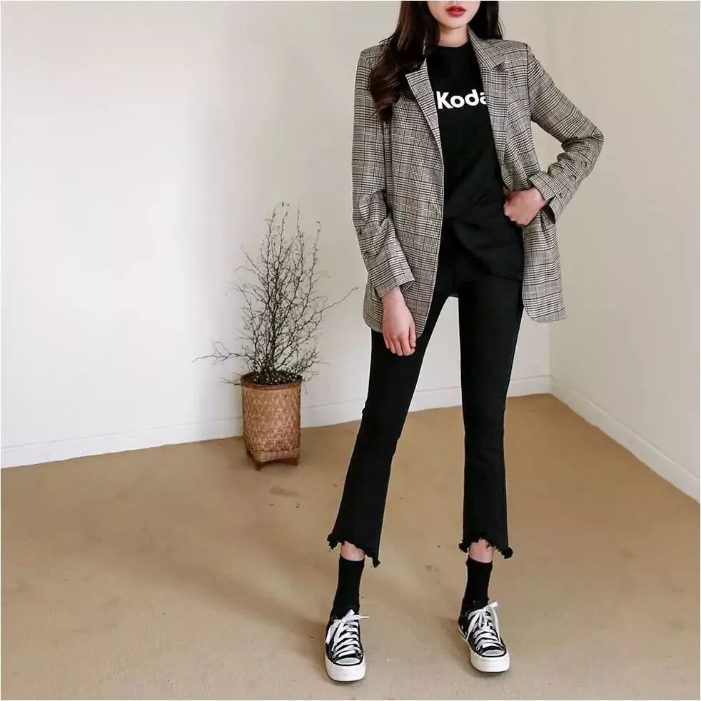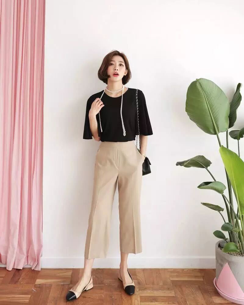 无论是裤子本身的版型是九分还是卷边打造出来的九分裤。总之露出的那一截细细的脚腕能让人产生无尽幻想。高腰阔腿裤搭配黑色T恤,简洁大气,换一双高跟鞋会更有女人味更有气场。