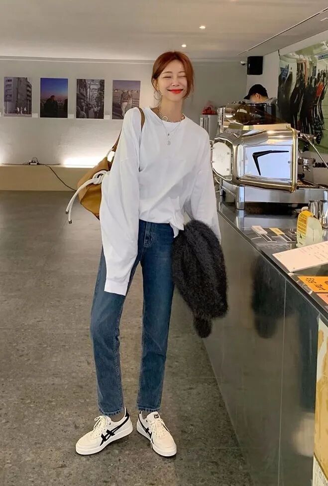 对于梨形身材而言,用紧身裤搭宽松卫衣不一定如预期那样显瘦,不妨选择直筒型的牛仔裤,扬长避短,实用度更高。