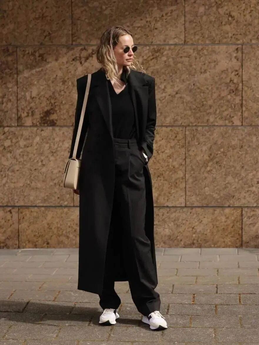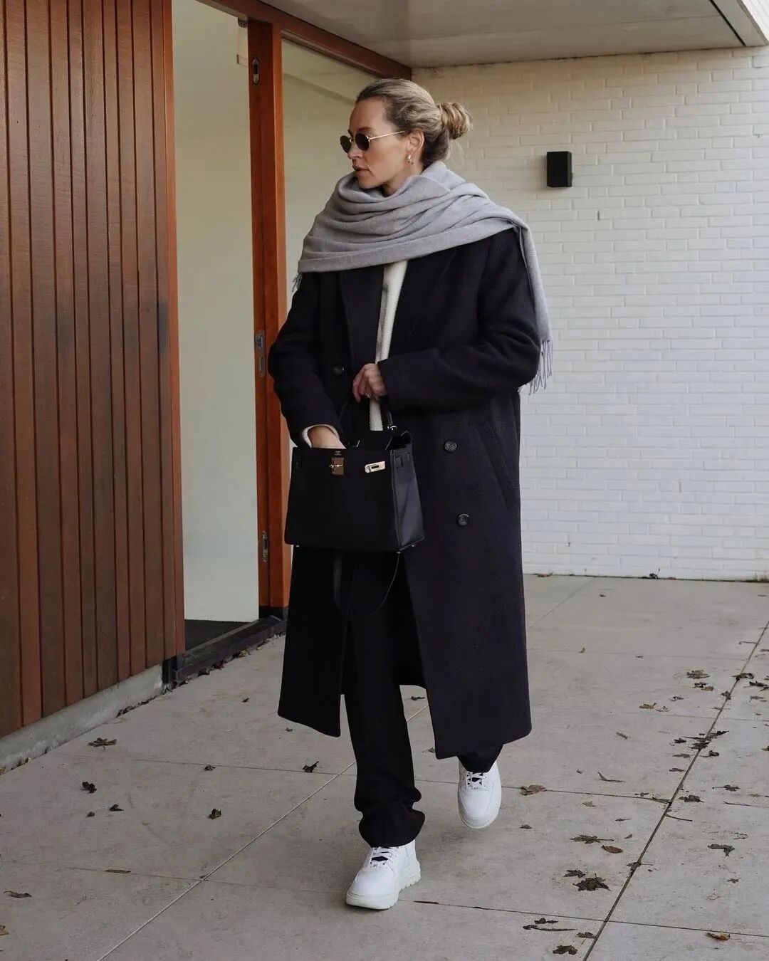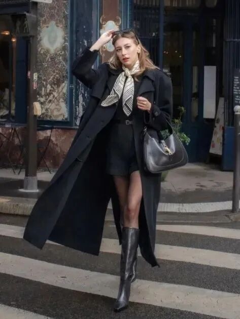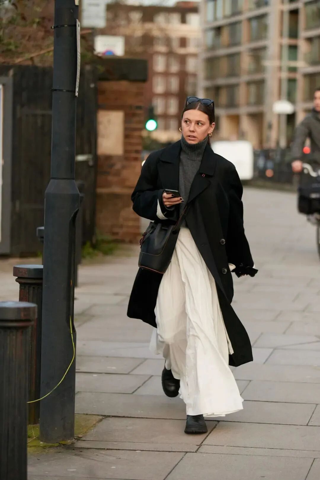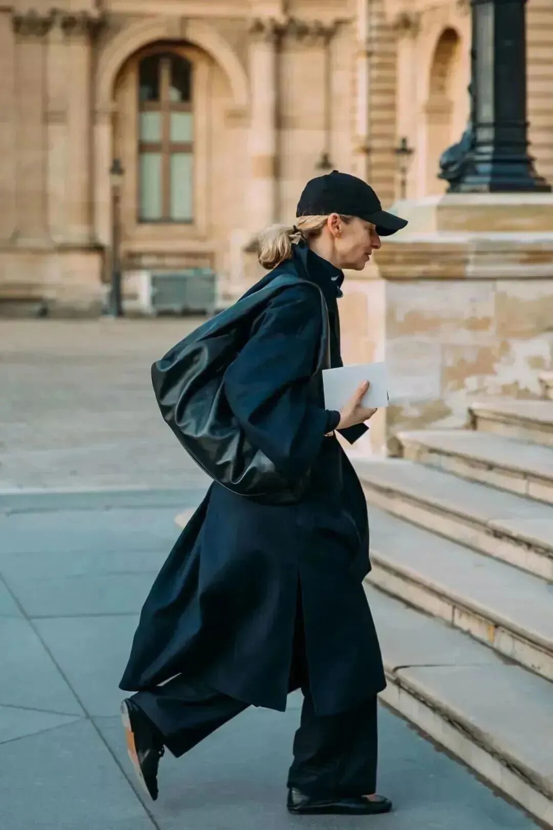 黑色大衣作为基础,非常百搭,可以与中性色单品相得益彰。