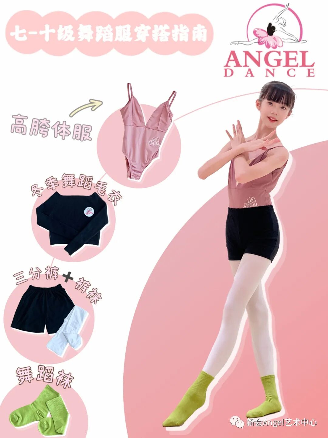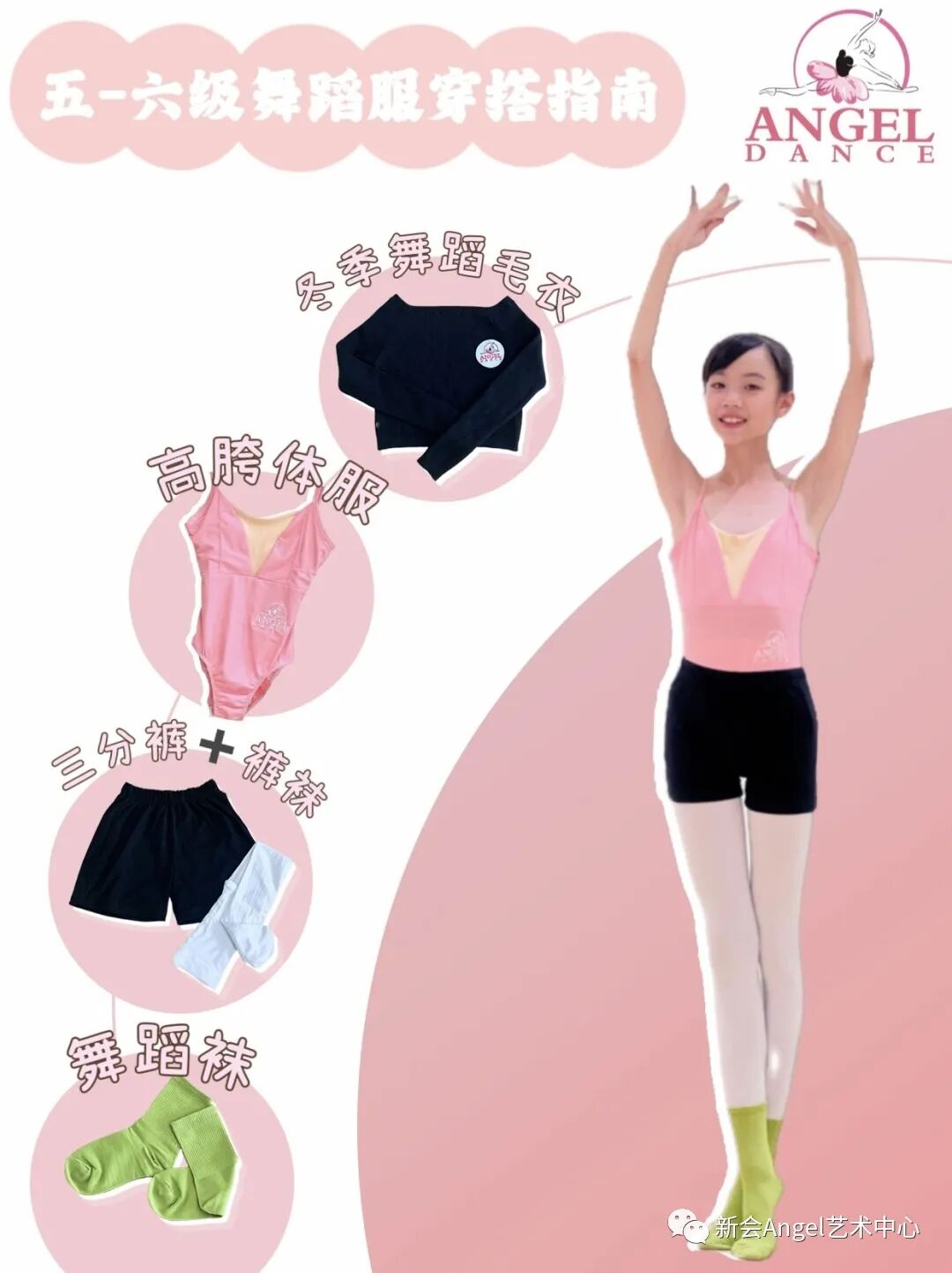 现ANGEL舞蹈艺术中心,中国舞第五到十级,推出以上统一练功穿搭万能指南:高胯体服+三分裤+连体袜+舞蹈短袜+毛衣(冬季)。