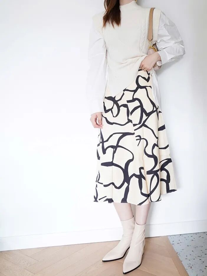 裙子的花色我很喜欢,虽然是黑色与米白色的经典配色,但是图案的设计使它组合起来有亮点,但又不突兀,很好做搭配。