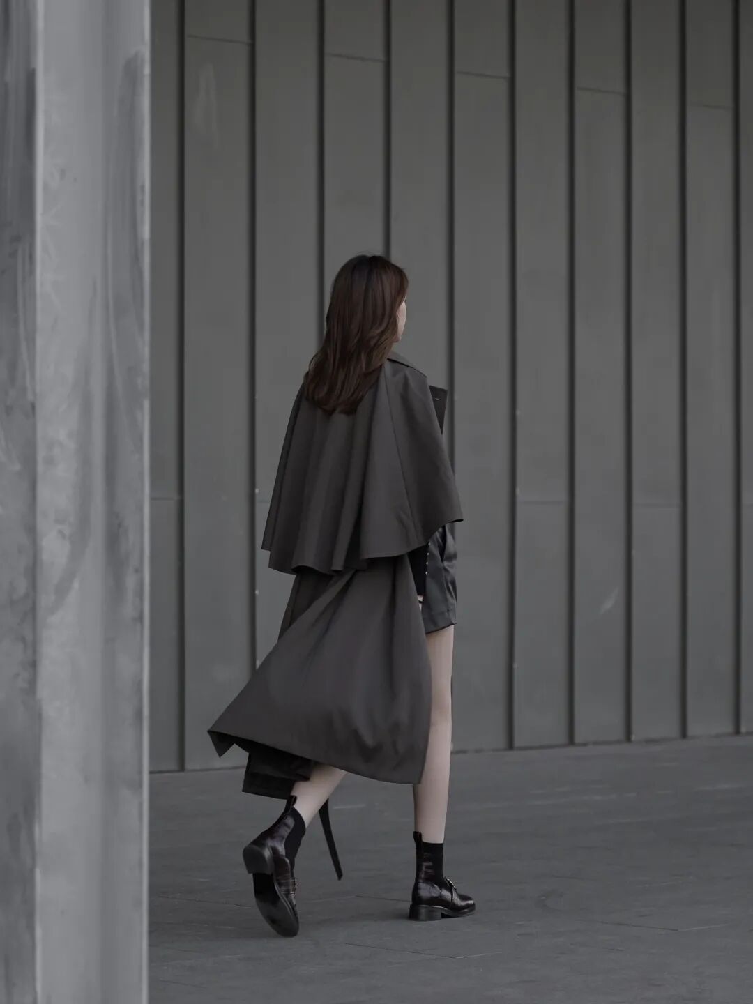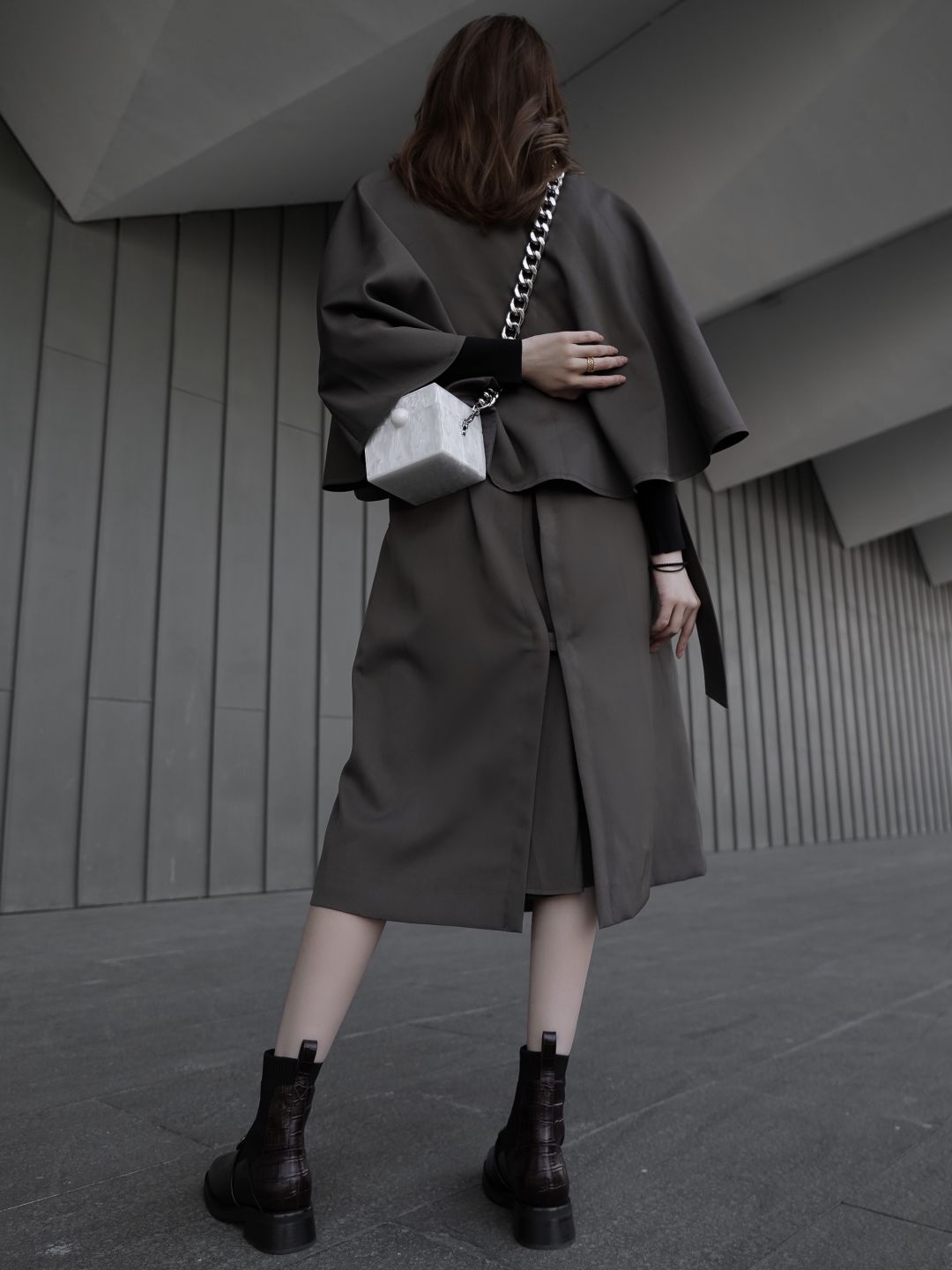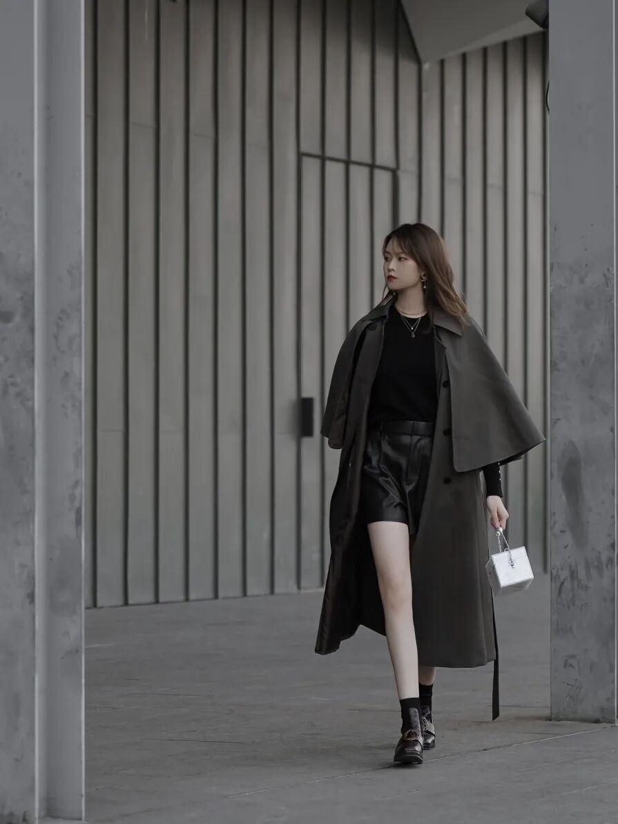偏大的 oversized 版型能很好的隐藏身材缺陷,与修身的风衣相比,弱化了职业感,反倒更加随性、利落。偏薄的材质,走起路来飘逸自带气场。更重要的是,会显得后背更纤薄。