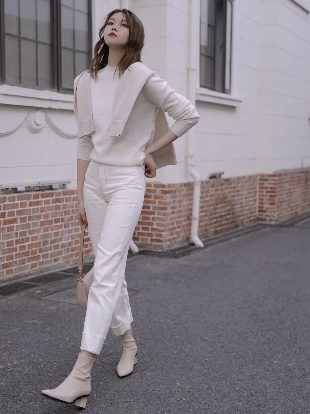 米白色适合搭配一些清爽的色彩,比如同色系对比不强的白色和淡卡其色,能瞬间提亮整体色感,还给人一种清冷的感觉。