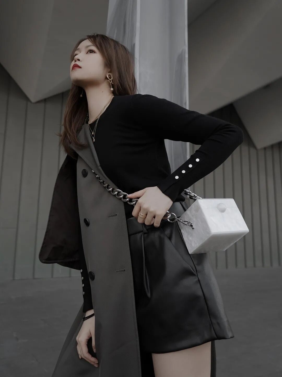 但是呢,长大衣一不小心就会穿的臃肿,上海的天气还能露腿。和上一套look一样内搭小高领针织衫+短款裙,黑色内搭与奶白色大衣形成对比,视觉显瘦。