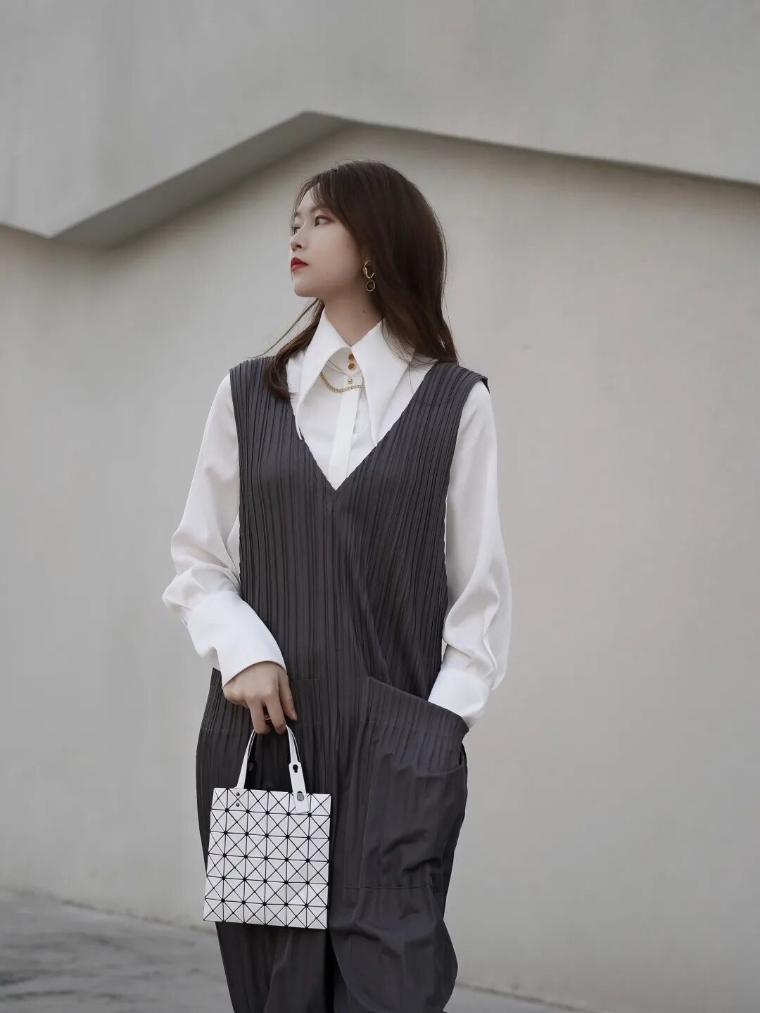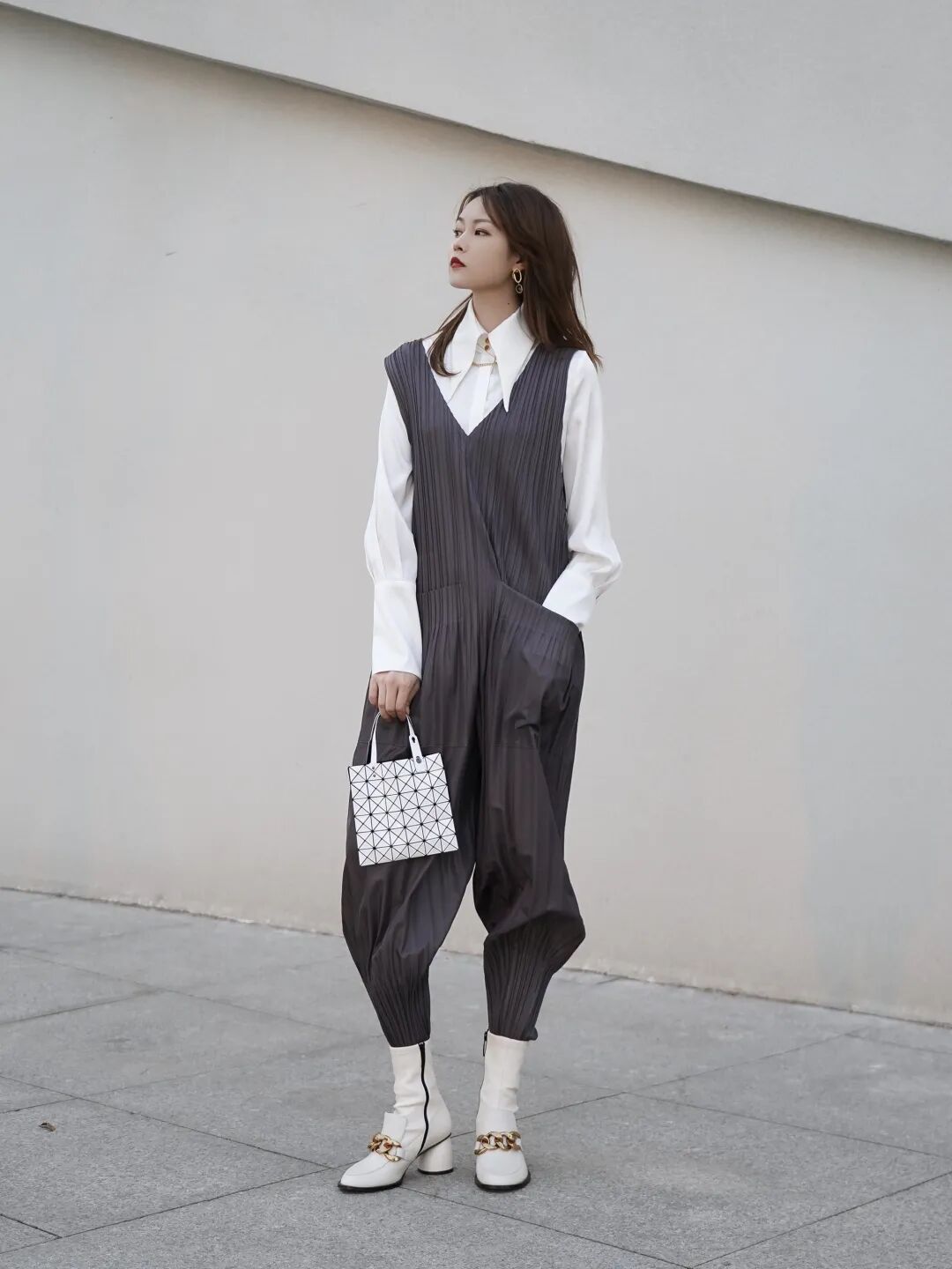 如果是比较偏正式的衬衫,我反而会选择搭配休闲的单品叠穿。我搭了一件PLEATS PLEASEISSEY MIYAKE三宅之褶的连体裤。整体搭配有设计又不缺正式感,上班这么穿吸睛又不会出错。