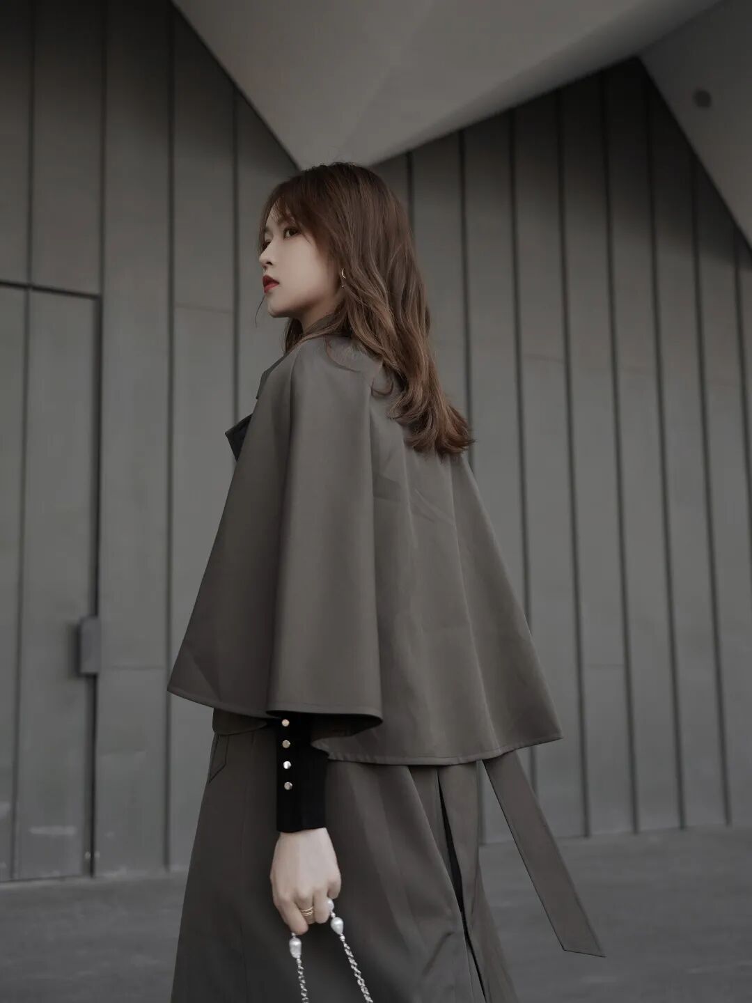 这件风衣的设计的特别之处在于袖口设计,假披肩,无论敞着穿还是扣上穿都很有味道。