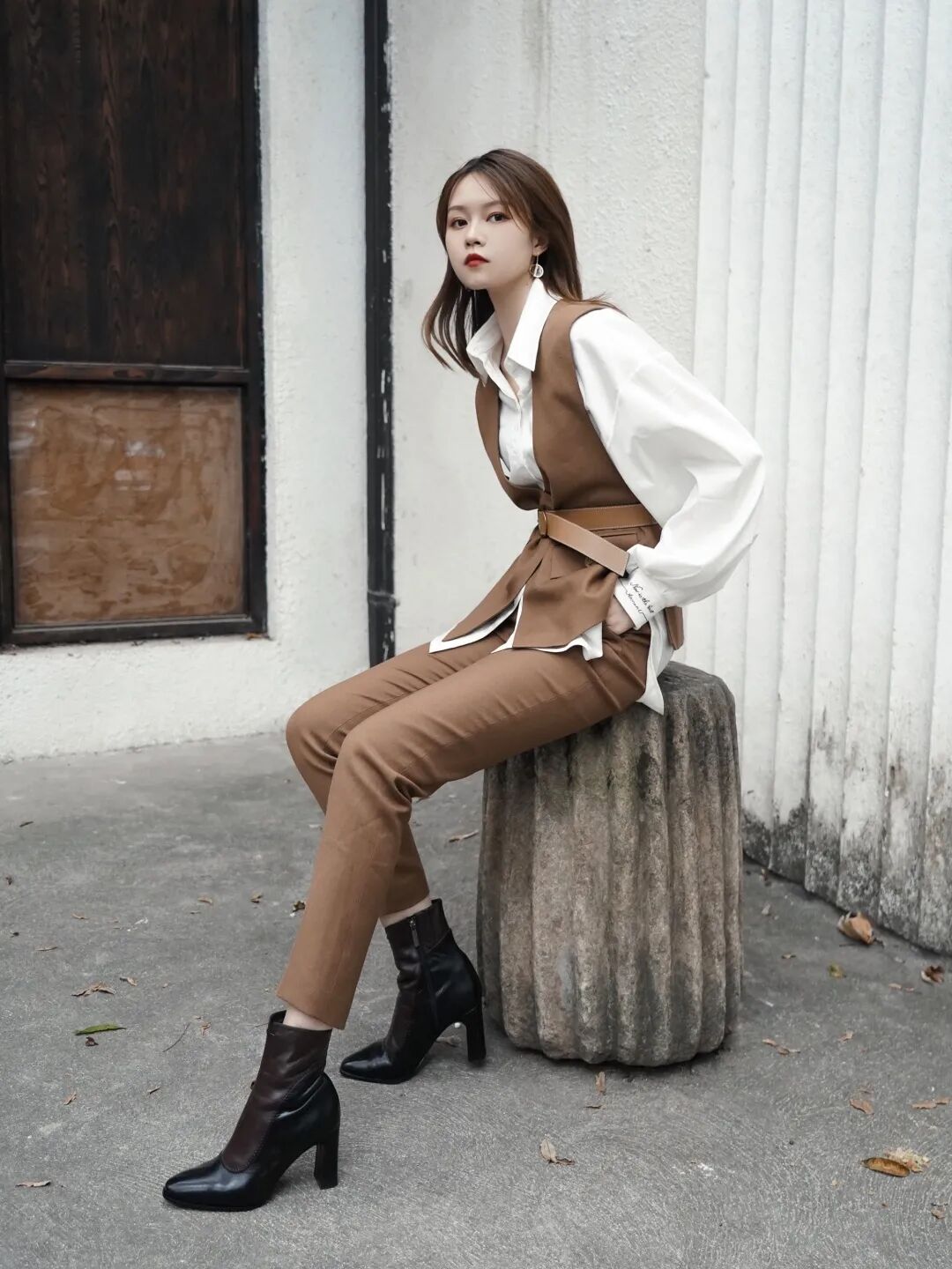 这一套是我近期最爱穿搭top3,打工人可以把严肃的成套穿搭换成西装马甲+白色泡泡袖衬衫,经典焦糖棕色系格调感十足。
