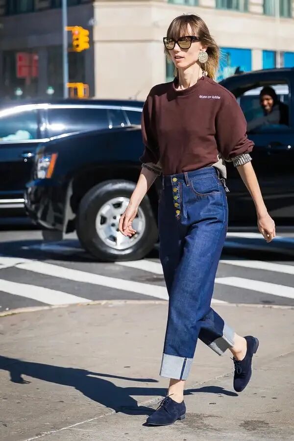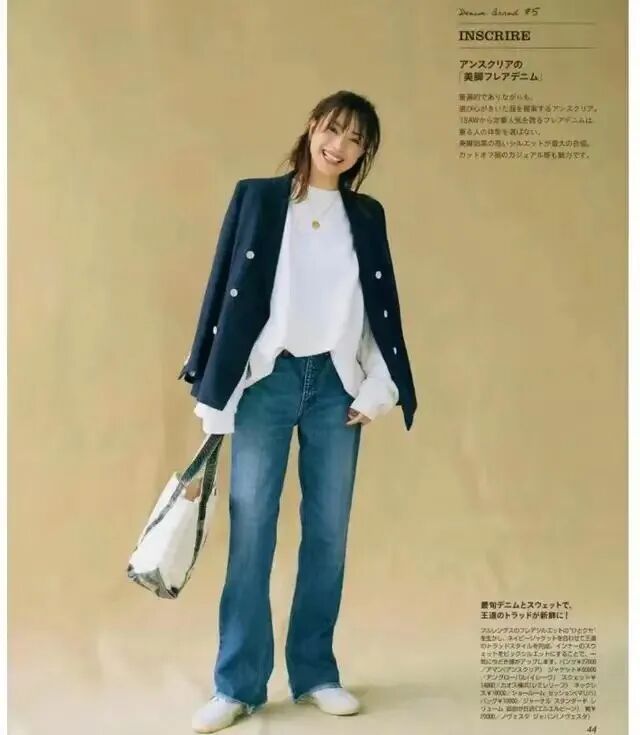 与成熟女性来讲,搭配上藏蓝色的西装外套,增添了一种干练的感觉,刚好融合了纯白色卫衣所带来的稚嫩感,下半身搭配蓝色的长款牛仔裤不是非常的正式,但是将魅力和气质都提升上来了。