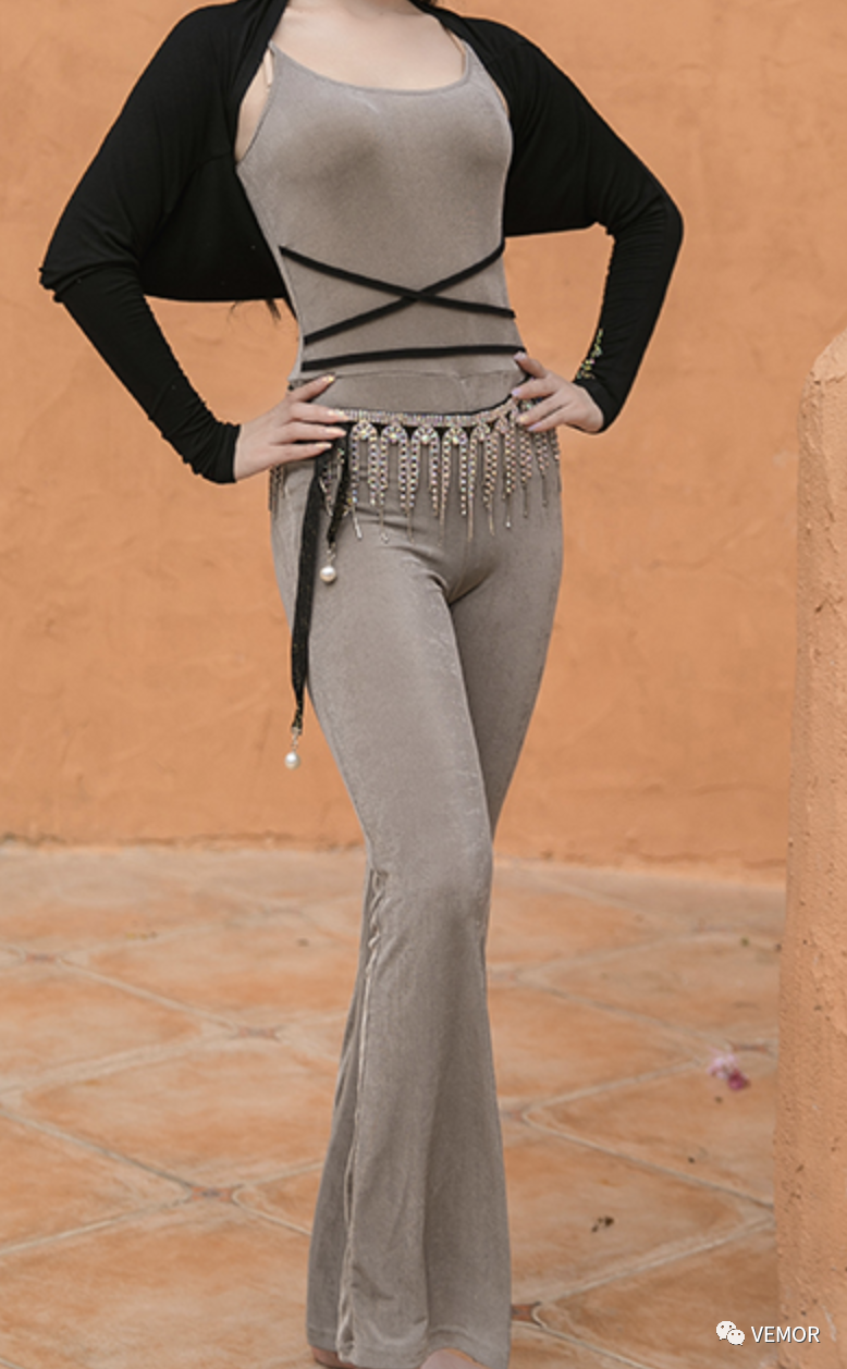 学习东方舞时可以选择练功连体长裙,修身的同时美观便捷,没有搭配的烦恼,而且还能遮挡身上赘肉较多或者其他不足的地方,算是身材友好的首选了