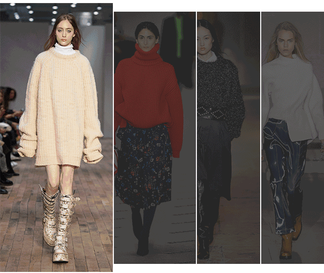 更大胆的搭配还可以在毛衣裙里穿裤子,前提是裤子不可以太宽松哦~最右边的高开叉也是很值得学习的尝试。