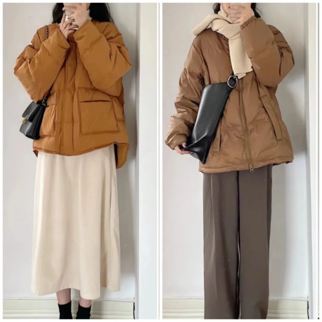 这种卡其色的羽绒服真是一绝,不挑肤色,不挑体型搭配白色长裙知性温柔,搭配长裤尽显慵懒。