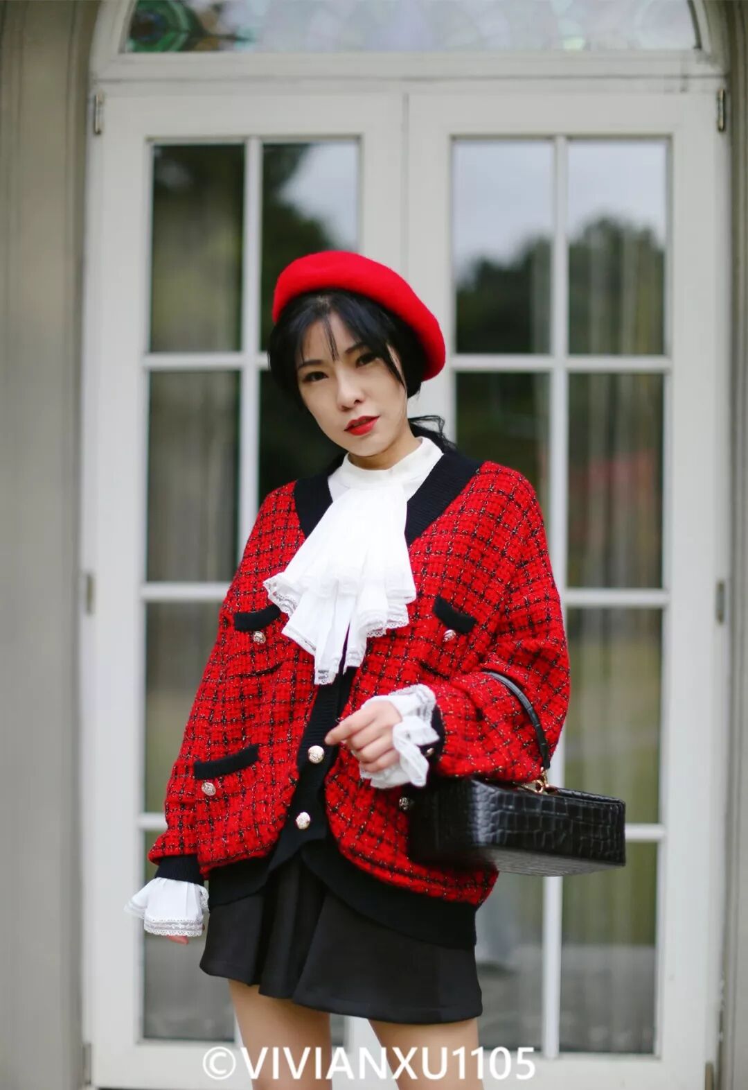 把红色小香风毛衣开衫扣起来,内搭宫廷风白衬衫和小短裙,呼应头上的红色贝雷帽,谁还不是个温柔小女人?