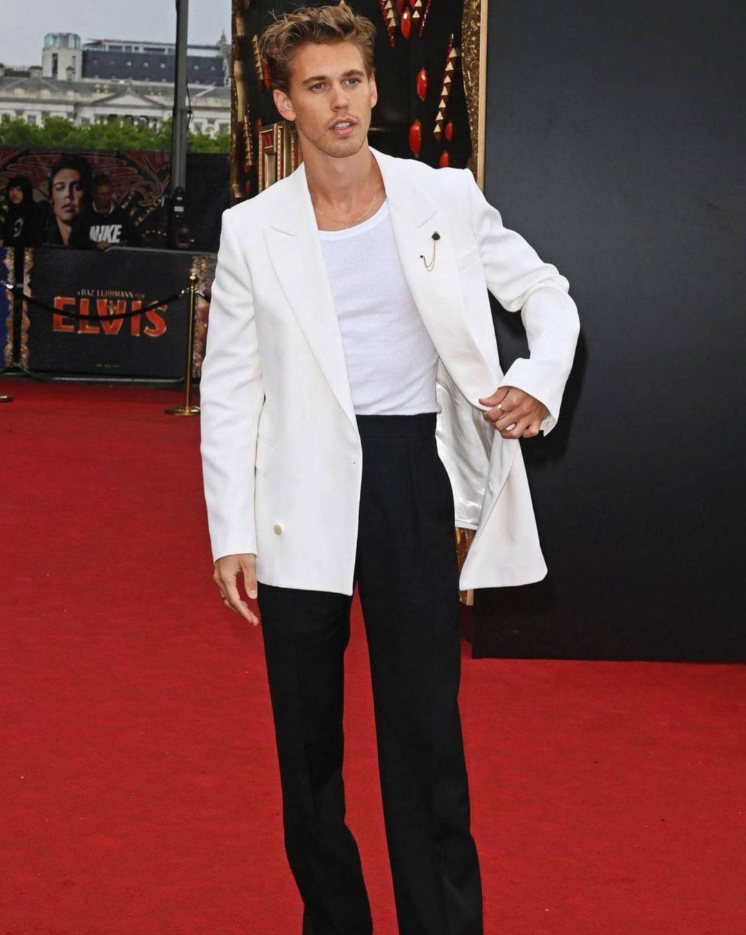 Austin非常喜欢搭配白色背心。比如这次他穿上Alexander McQueen的白色西装外套配黑色长裤后,同样选择了白色背心,营造出六七十年代男星的风格,与他在电影中扮演的角色Elvis Presley非常搭配。
