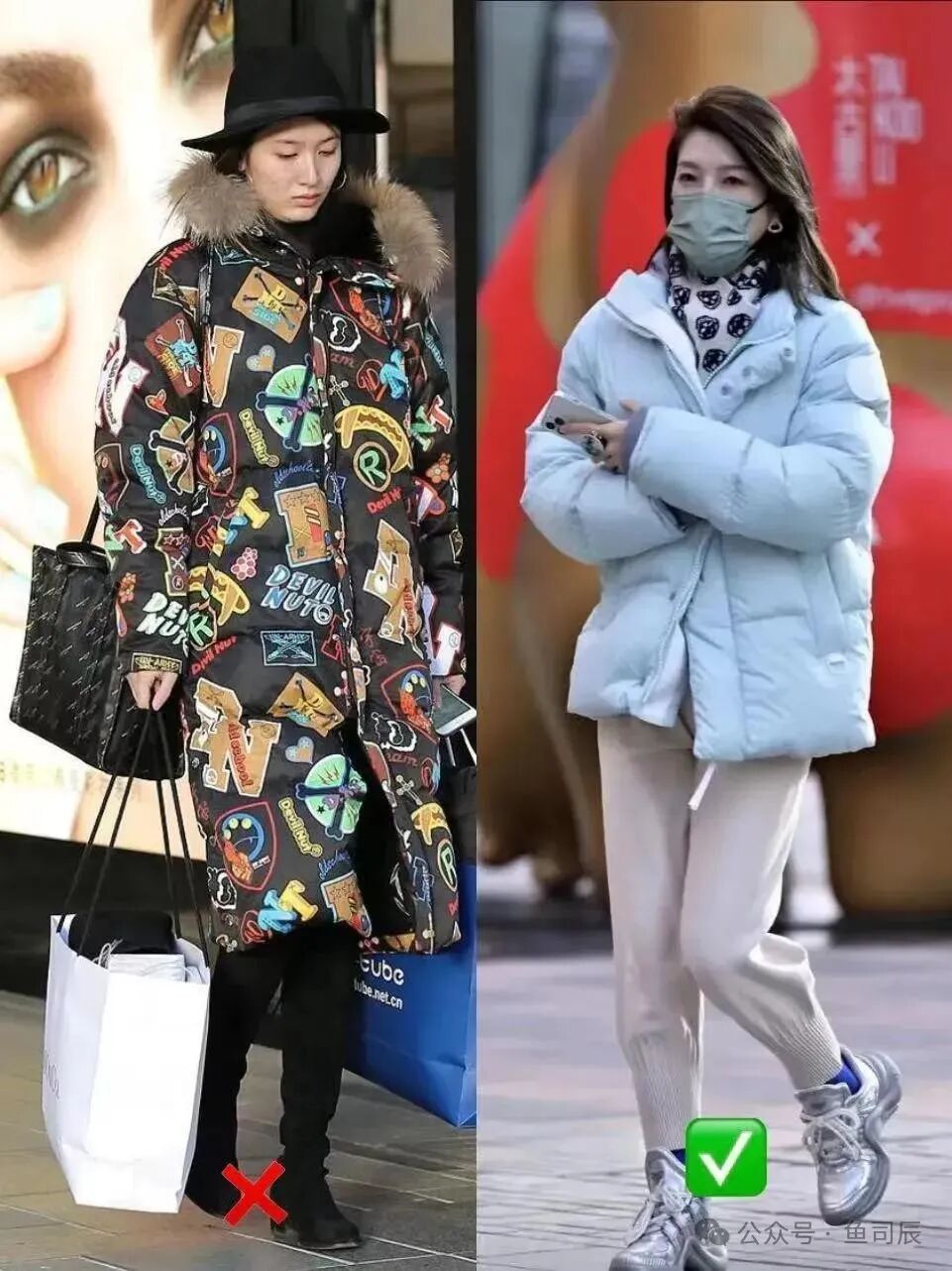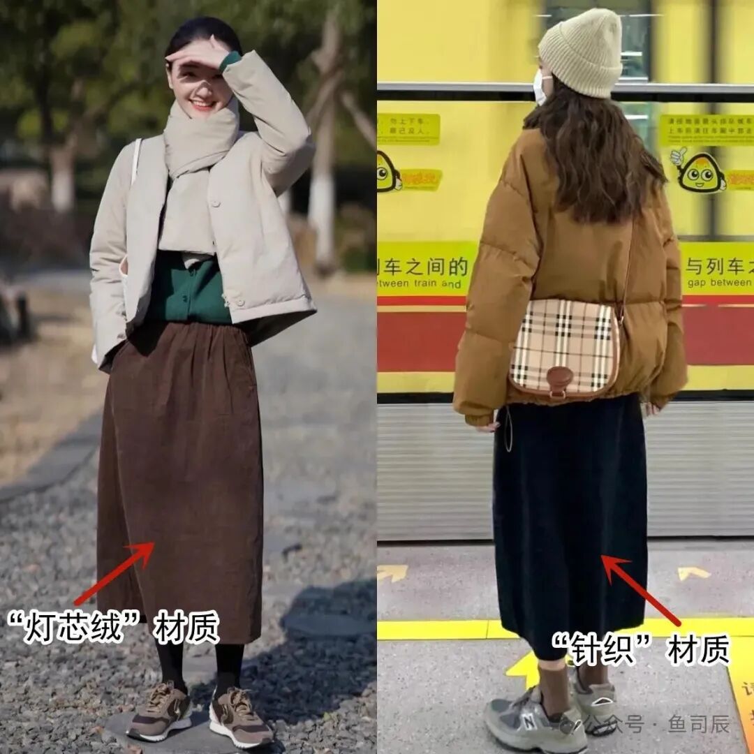 三,羽绒服搭配半身裙用羽绒服和裙子搭配,确实能穿出女人味,展现出优雅感不过,选择的裙子也很关键,例如下面右边的这一条白色的薄纱半身裙和羽绒服搭配,根本不适合现在的天气,加上这一条白色的薄纱半身裙,看上去有一种廉价感。