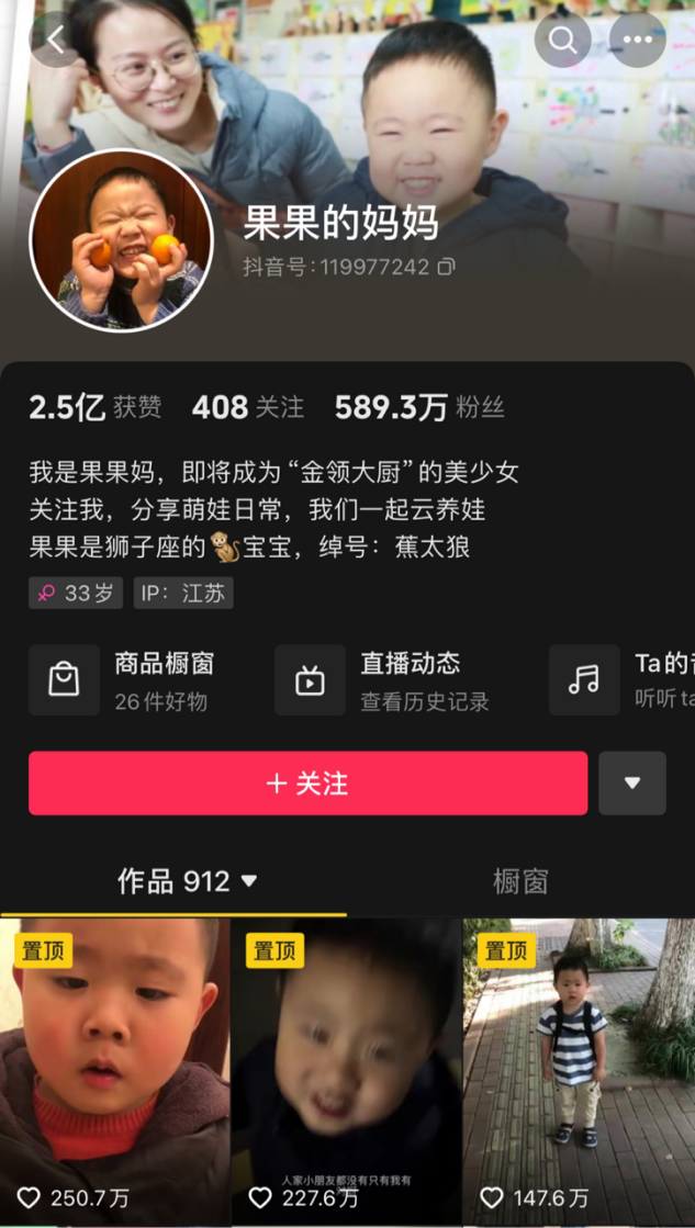 视频结构:前半部分趣味搞怪,后半部分循序渐进,迸发情感,引人深思,催人泪下!不得不佩服小麦妈妈的顶级文案和育儿理念,这个号非常值得大家学习3.果果的妈妈(588万粉丝)单亲妈妈带儿子白手起家的励志故事!。