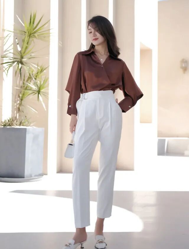 2、 暗红色衬衣+白色直筒休闲裤夏天由于天气炎热,穿衬衣的女性数量会少很多夏季也不是说和衬衣完全隔离的,主要是看衬衫的面料像这一款冰丝面料就非常适合夏季来穿,冰冰凉凉的,很有清爽感下半身配上白色的直筒休闲裤,拔高腿长的同时又能修饰腿型,简直一举两得哟~脚上再加上一双穆勒鞋,很是养眼哟。