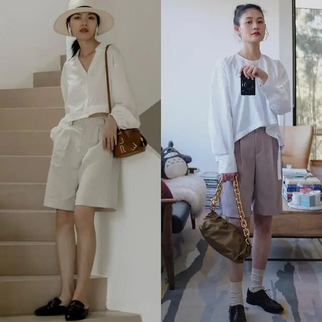 经典的白衬会带来比较多的正式感,而时尚博主利用百慕大短裤化解了衬衫的呆板和正式这类裤子一般都不会太挑剔腿型,宽松的版式让它对身材的包容性更强了,也比普通的短裤更加时髦也正是百慕大短裤的加入,让衬衫穿出了慵懒、随性的既视感。