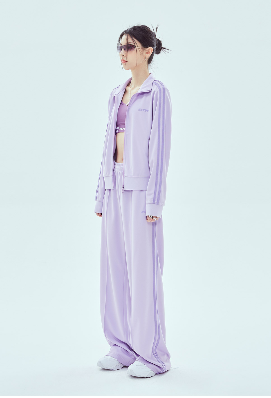 NERDY调出的这个紫色非常好驾驭,色调也比黑、米白色随性灵动了许多,减龄效果可见一斑 Ws Cropped NY Hoodie Zip-up & Ws NY Sweatpants连帽短款 活力性感 。