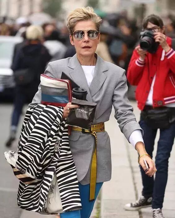 金色的腰带让一件平淡无奇的灰色西装变成轻奢优雅范儿。