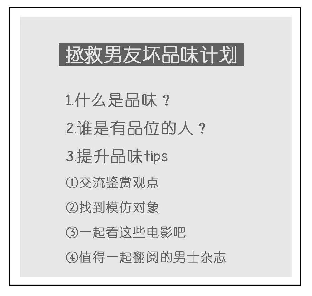 有姐妹问:男朋友品味太差怎么办?总不能像老师教学生那样去跟对方讲吧。那是自然。毕竟品味这种东西是一种审美感觉和时尚敏锐度,不是用嘴说一说就可以改变的,相反却常常能潜移默化的受到周遭的影响。