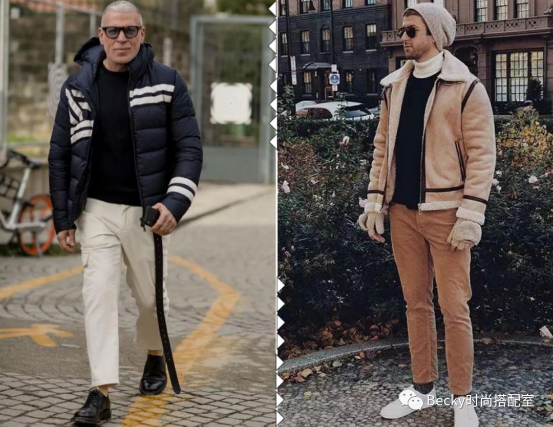 WED06圆领毛衣+厚外套黑色圆领毛衣简单套上一件条纹羽绒外套,都能穿出潮流时尚范,下身配上白色休闲裤让型男魅力上升,又可以内搭高领针织衫,配上驼色系羊绒外套、灯芯绒裤和冷帽手套,视觉层次穿搭,潮流十足的街头 Look !