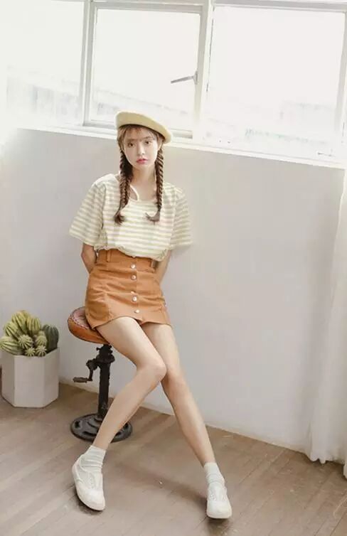 时尚搭配七:拥有娃娃领的浅蓝色衬衫搭配棕黄色A字裙,乍一看颜色不搭,但是整体搭配起来很有少女的气质,清新自然啊。
