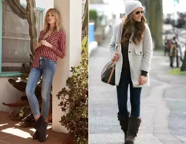 2、搭配紧腿牛仔裤担心自己小腿粗、线条不够好看的可以选择鞋筒翻卷款,穿上后立马修饰腿型。牛仔裤和雪地靴很搭,若隐若现地露一点脚踝或者露出一双图案好看的袜子,就很Chic。