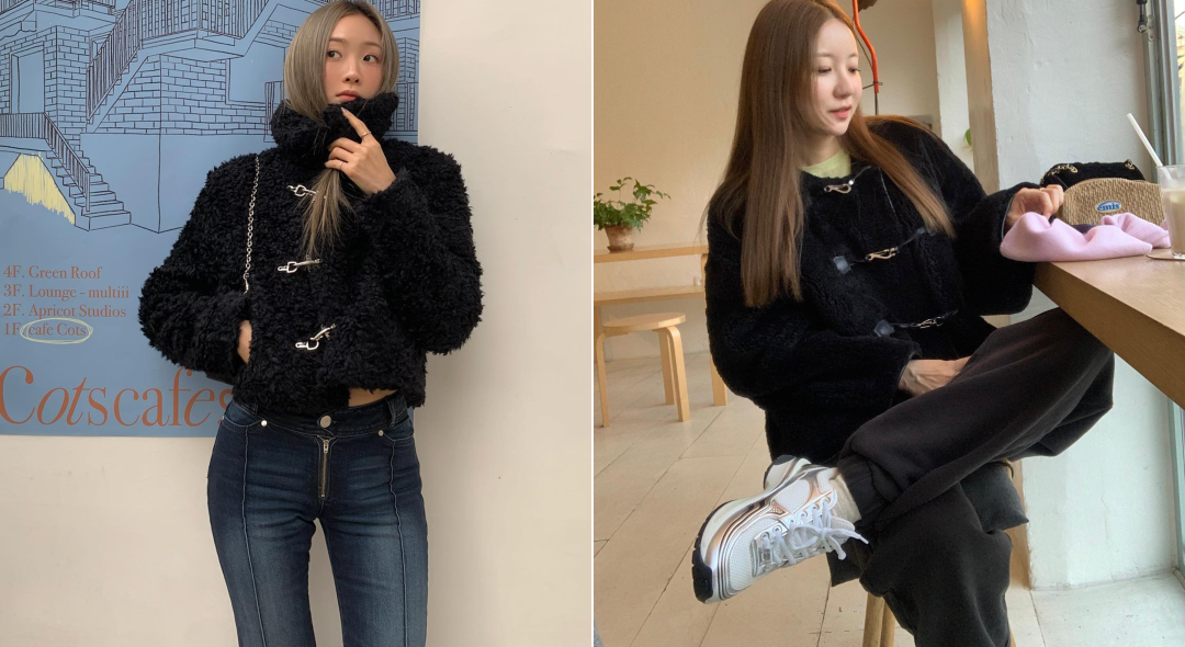 最后这款是羊羔毛的长款外套,因为是全黑的很酷,适合姐姐和辣妹~