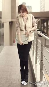 皮草马甲相对与皮草外套来说更容易驾驭,白色的皮草马甲配上裸色上衣,下身配上黑色铅笔裙、黑丝袜以及短靴,优雅迷人。