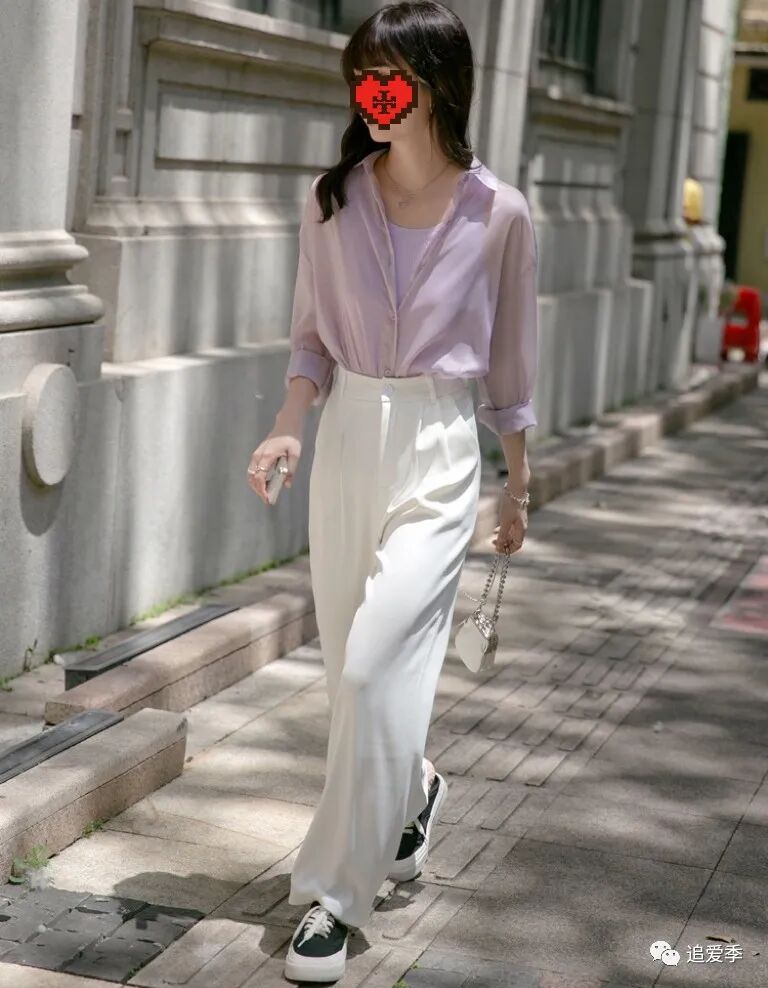 初夏的时候,紫色的雪纺衬衫,女人味十足。将衬衫下摆塞进高腰的长裤中,三七比例更加明朗,是一种时髦又显高的搭配。❤️紫色裤子+米黄色上衣搭配