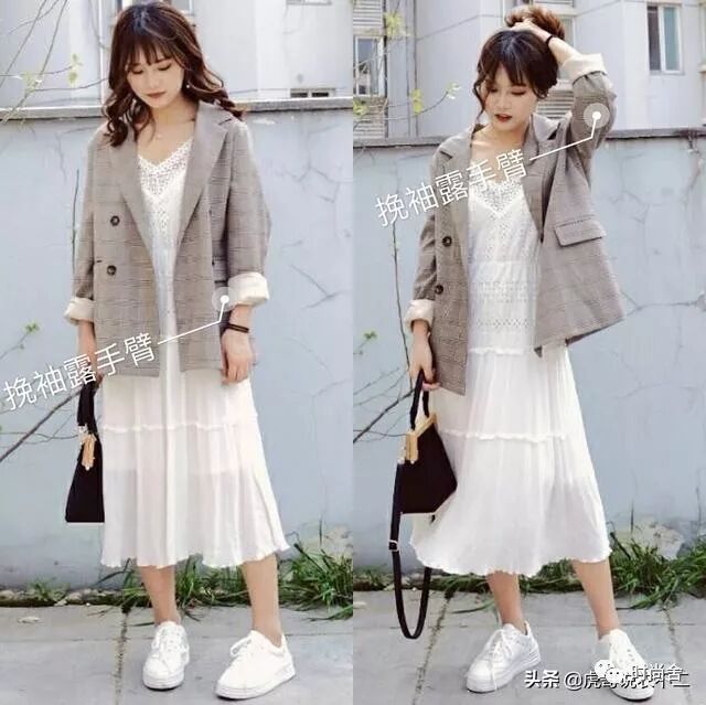 ▲虽然已经进入夏天,但是有没有感受到这几天的冷空气,所以一些薄外套还是必不可少的哦!挽袖子露手臂可以很好的展露你光滑细嫩的肌肤,给人视觉上一种甜美清新的感觉。如果将袖子放下,会给人一种特别沉闷的感觉,而特别沉闷的话,就会让人有一种显矮的感觉,千万别小看这一个露手臂的小动作,对小个子来说还是有很大影响的哦!像图片中模特这样,一件白色的蛋糕裙,仙气十足,本就给人一种清新之感,外套格子小西装,挽袖露手臂,清新甜美,瞬间达到显高显瘦的效果。