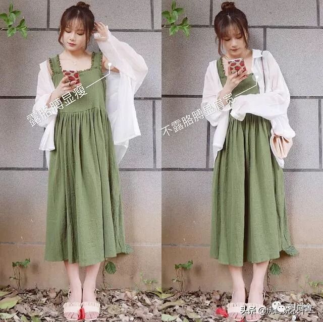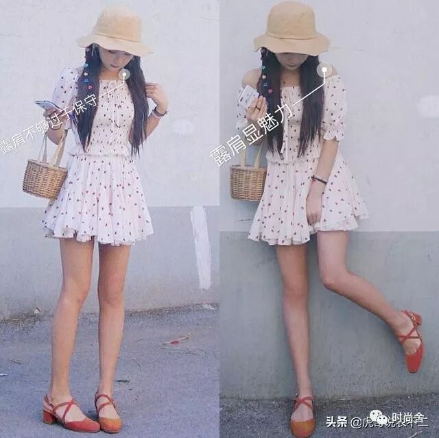 ▲小个子女生穿衣尽量穿露肩装,一方面让人的视线聚焦你的上半身,忽略你的身高,一方面露肩上衣还可以缩短上半身,配合高腰线可以更加的显腿长。看上面的一套衣服两套穿法,虽然都是同一件衣服,但是左图给人一种身体蜷缩在一起,过于含蓄的感觉。右图露肩装,给人一种感觉就是自信又有魅力,加上连衣裙又是小碎花元素,更是清新可人,巧妙的化解了身高尴尬。
