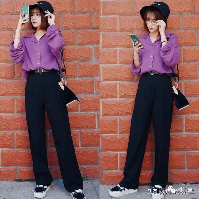 ▲小个子女生想要穿的知性优雅,一定要这样搭配。紫色的衬衫简单大方,深V领的设计,勾勒胸部线条,恰到好处的展现女人的知性美。下穿高腰阔腿裤,记住,一定要是高腰,这样才能拉长身材比例,制造舒适优雅的气质。