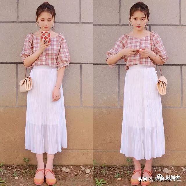 ▲格纹元素一直是这几年的流行元素,浅红色的格纹无领衬衫,清新甜美,下搭白色蛋糕裙,若隐若现露出大长腿,性感撩人。上衣掖在裙子里,为了更好的凸显腰线,打造三七分的身材比例。如果不掖的话,给人的感觉就是整个人身材五五分,会有点显矮哦!