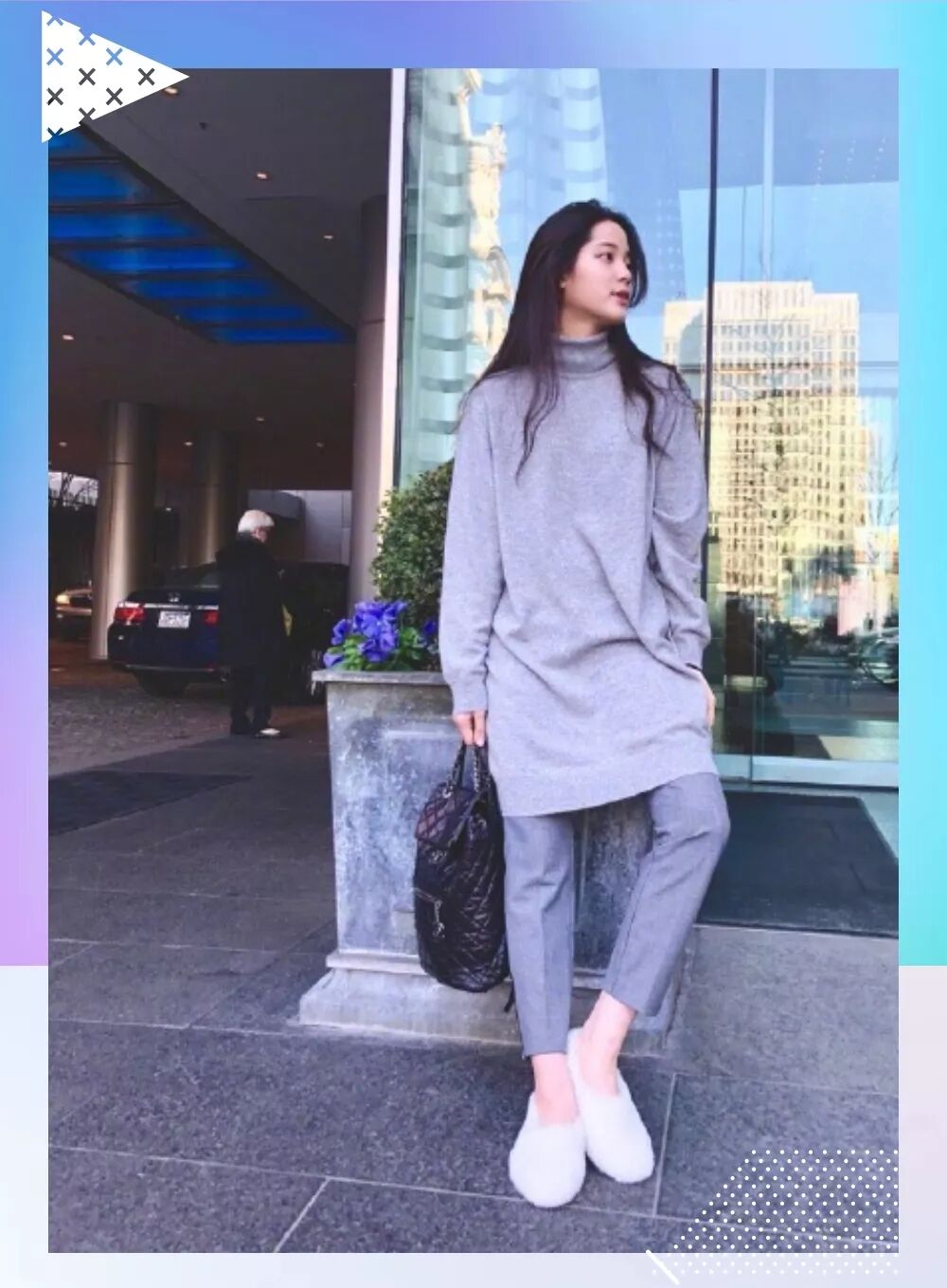 我把这归功于她对包包的选择上,如果整体穿搭偏向基本款,就选一个特别的包包搭配,为造型提炼亮点。