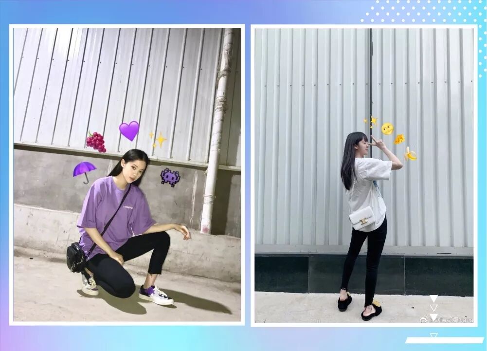 但绝大多数时候,娜娜还是会更愿意提高腰线,比如短款上衣配阔腿裤/长裤,完美展示腿长腰细的特点。