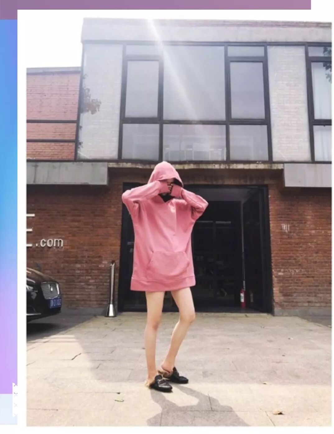 或者选择一件长款卫衣,来一次下半身失踪,同样能达到显腿长的效果。