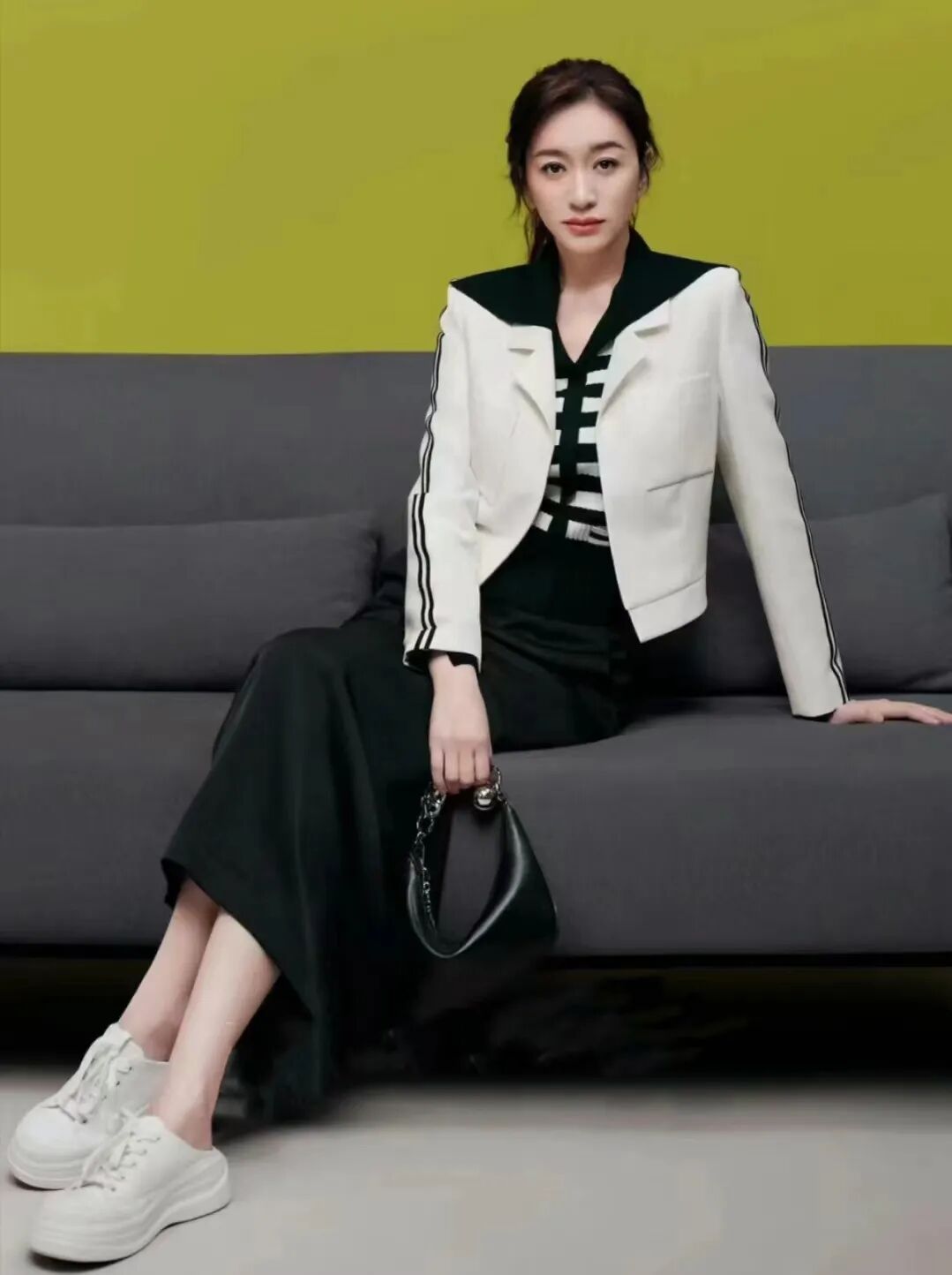 在颜色的选择上,李小冉同样展现出了高超的技巧。她常选的柔和、低饱和度的色彩,如黑色、灰色、米色和深蓝色,不仅突显了她的成熟稳重,还与各种场合的氛围相得益彰。而在需要的时候,她又能巧妙地运用亮色或对比色,为穿搭增添活力和焦点。