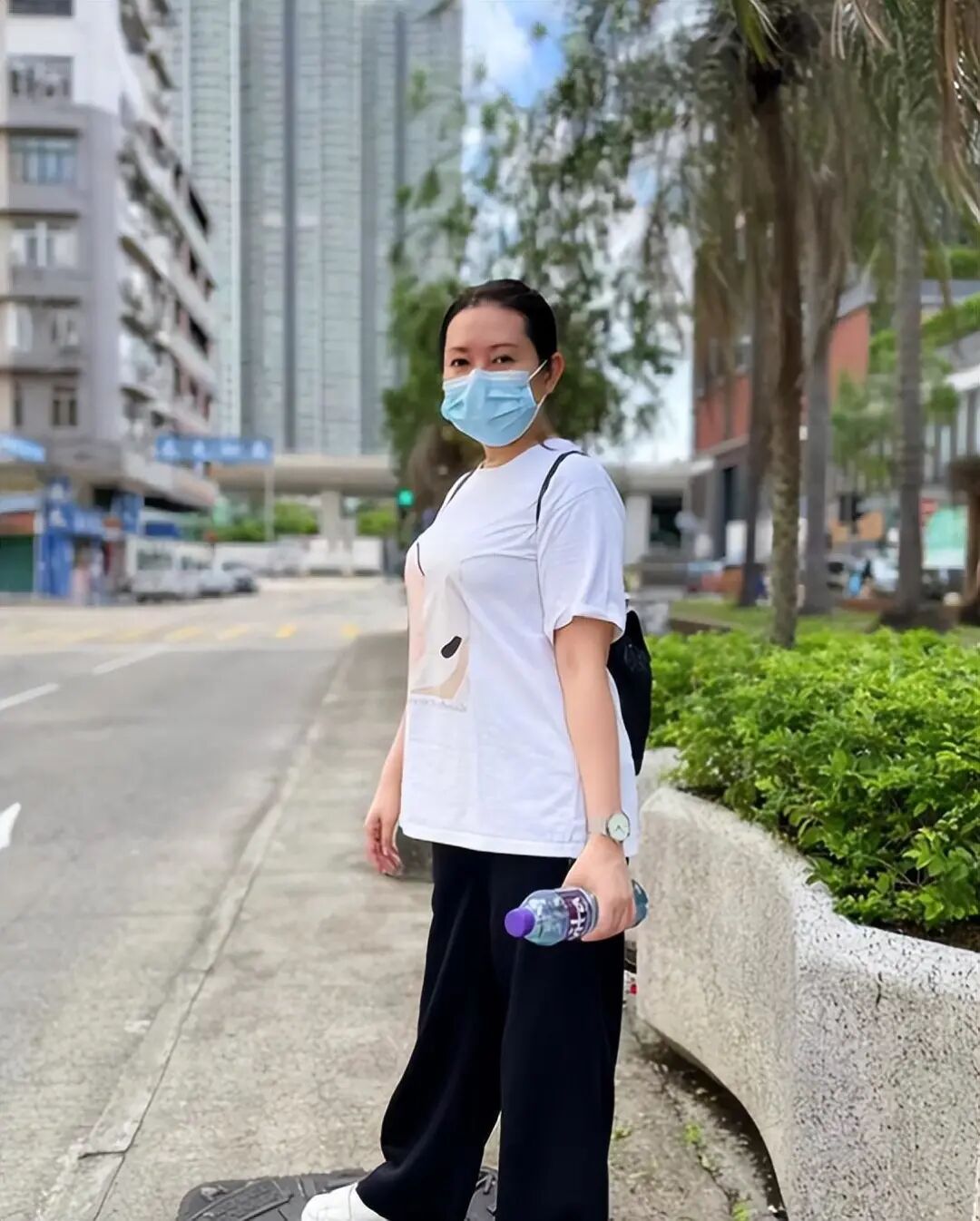 看的出来身体发福很非常严重,穿搭也是很随意,素颜配上这身打扮比路人还路人,圆润身材T恤挡不住,很难和以前的李丽珍结合起来想象。