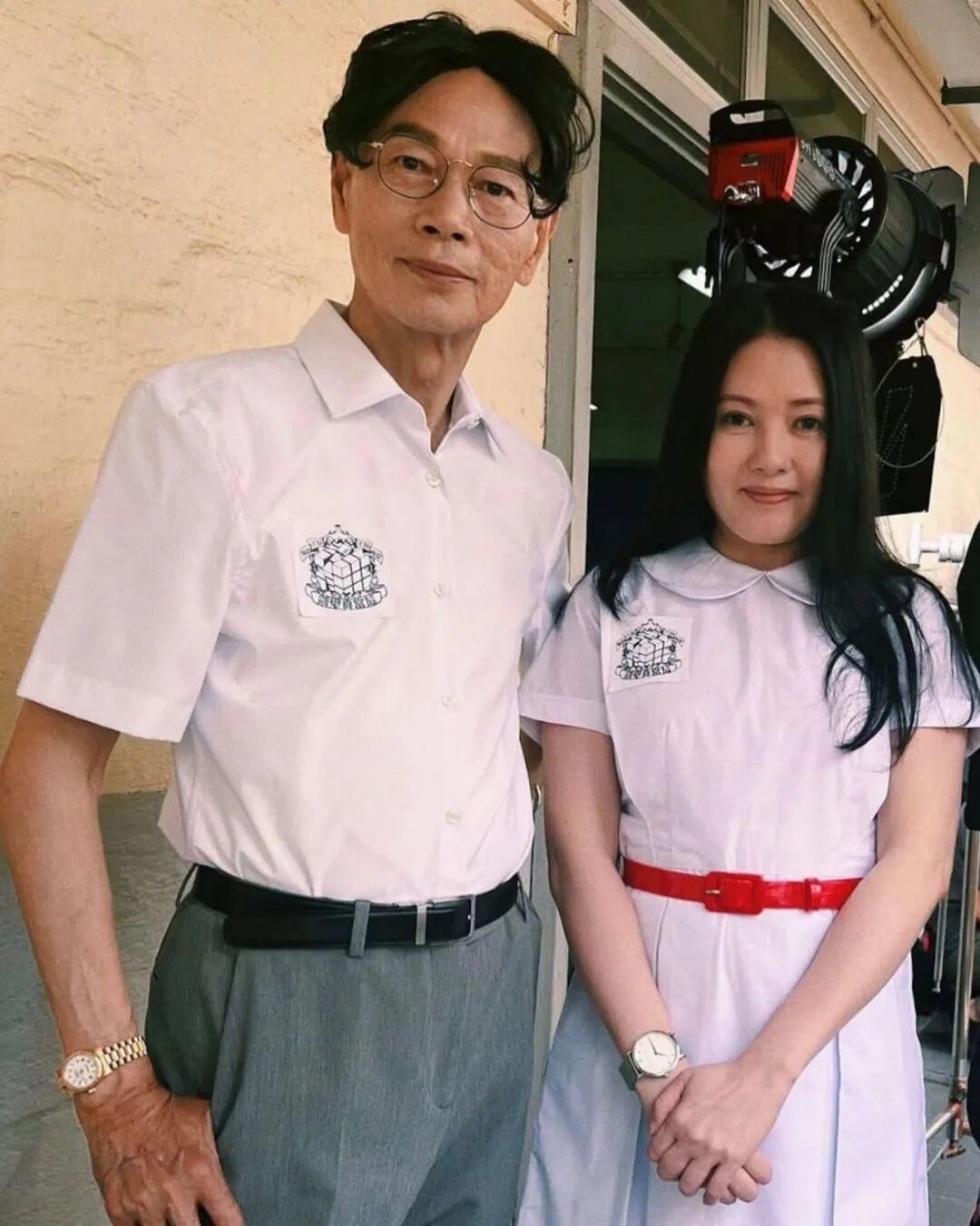 李丽珍复出后与罗家英合影,付出后的李丽珍再次出演学生,一身白色的学生连衣裙这气质和年轻时候比差距是有点大,56岁了再出演学生着实有点勉强了,还是身材发福比较严重。