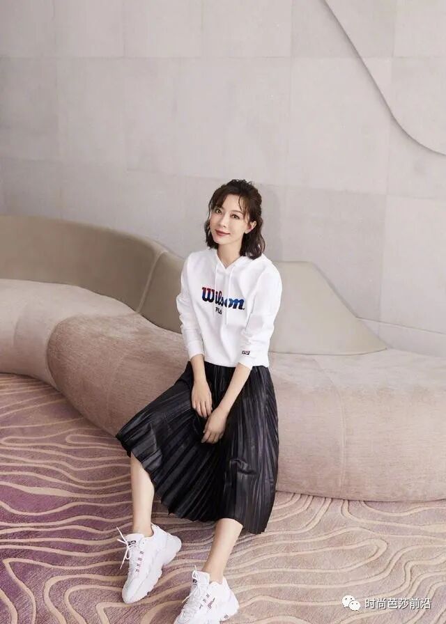 为了避免这些问题,我们在选择卫衣的时候,要尽量选择短款卫衣。比如说图中陈数的这套搭配,一件休闲时尚的连帽卫衣,搭配长款百褶裙。一长一短的搭配突出了腰线的位置,整体显得干练又利落,高高的腰线还拉长了下身的身材比例,穿出了显高的效果。