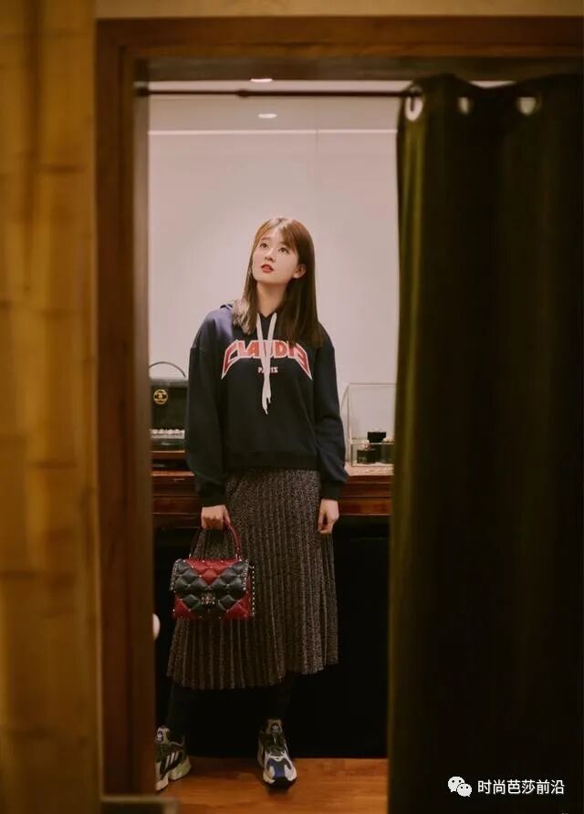 比如图中乔欣的这套造型,一件黑色的连帽卫衣搭配深棕色百褶裙,整体的深色系搭配给人的感觉既优雅又成熟,将两种不同风格的单品完美融合在了一起,是一种很高级的搭配。