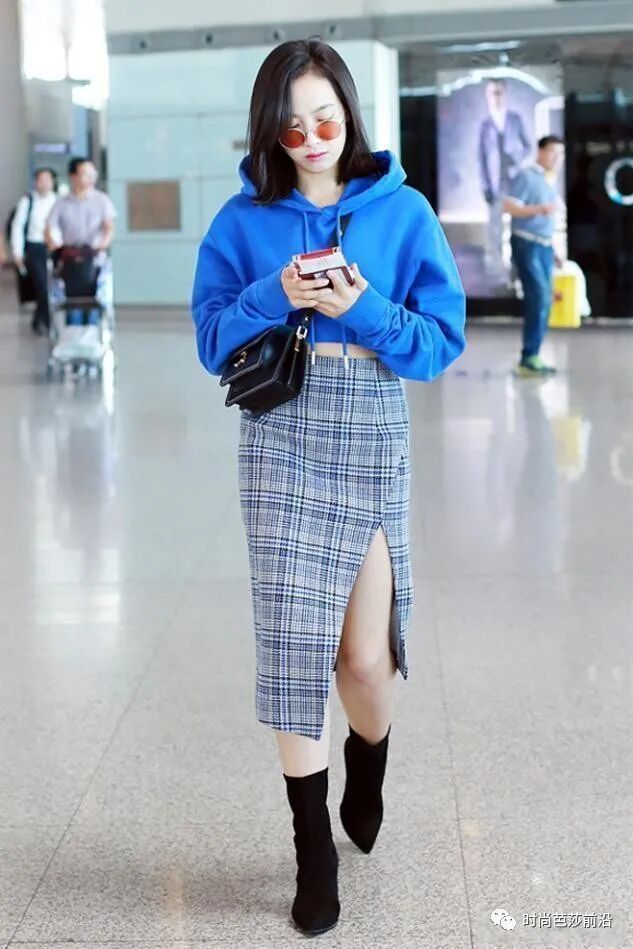 开叉裙是打造性感风穿搭的不二之选,但是在宋茜的搭配下,却将开叉裙穿出了别样的风格。宋茜穿了一件短款的连帽卫衣,搭配一件格纹开叉裙,格纹裙是典型的复古风单品,加上开叉的设计之后,为整体增添了一丝时尚感。而短款的卫衣不仅强调了腰线的位置,穿出了好身材。而且作为一件休闲风单品,它突出了裙装的风格,一简一繁的搭配,将开叉裙的复古与时尚气息完全展现了出来。