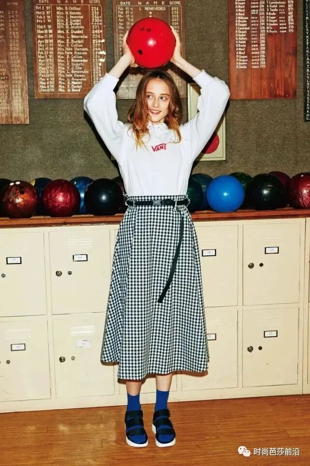 想要穿出原有卫衣的动感和百褶裙的俏皮,那么,在花色图案以及颜色上就要多做互补,这样风格也相对统一,搭配平底鞋、马丁靴都可以。