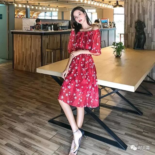 法式款的V领连衣裙,给人的视觉感就显得非常浪漫,有质感。法式风不仅仅体现在领口的设计上,更体现在印花的色彩上,看上去很显气质。你可以看下图中的红底白色五角星的印花,都显得很有活泼有质感,更有一种法国女人的浪漫气质,如果搭配上一双简单的一字带凉鞋就在完美不过了。
