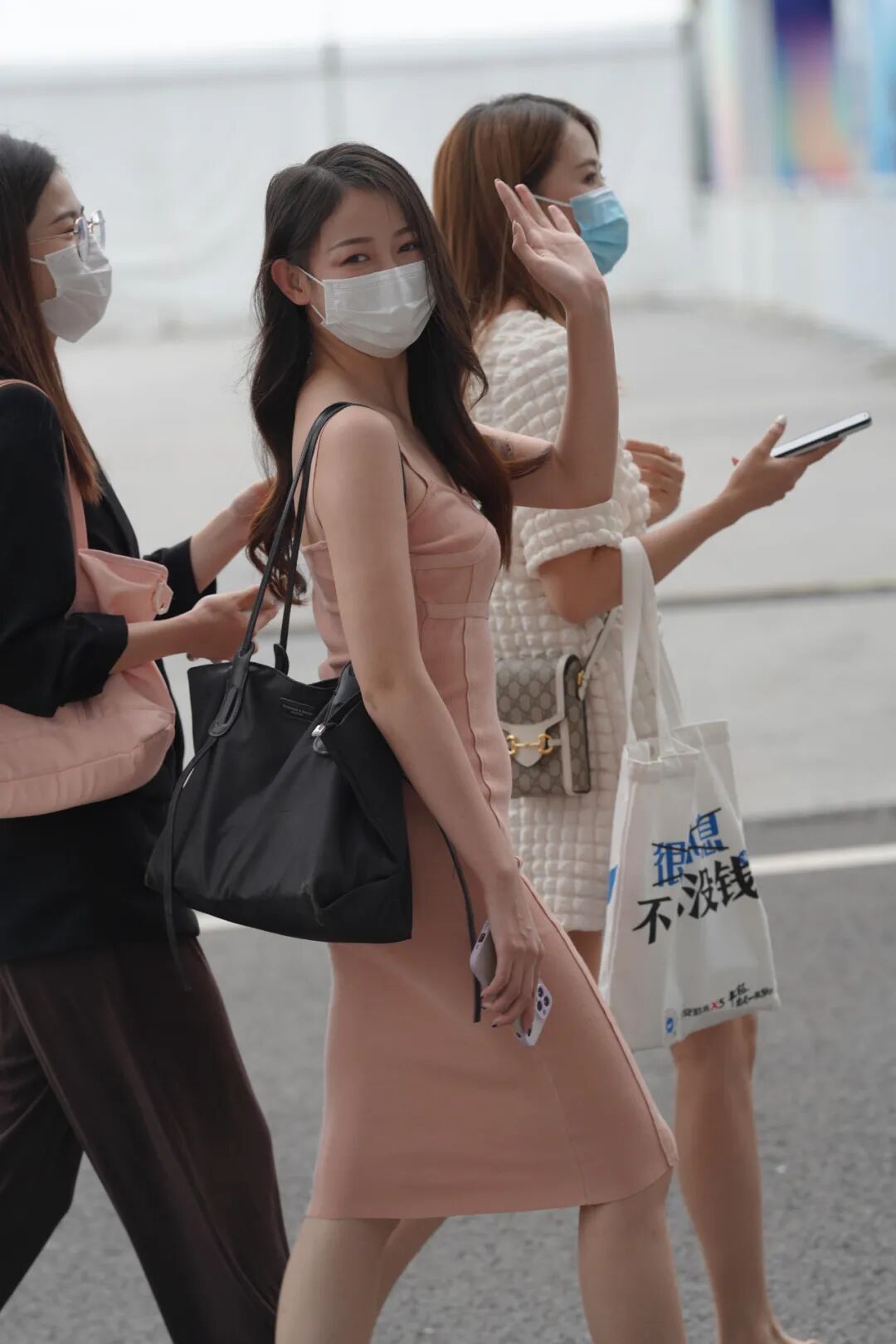 这身穿搭的点睛之笔应该是腰间的灰色腰带装饰这个腰带使用了轻盈的网纱质地通透又飘逸,松垮垮地垂在腰间,没有修身作用但是装饰效果很棒,与粉色搭配不仅降低了穿搭的亮度,而且提升了衣服的高级感和灵动感鞋子的搭配与腰带有异曲同工之处,都是灰色款,不过鞋子使用了精致又贵气的银灰色,颜色高级且极具美感。
